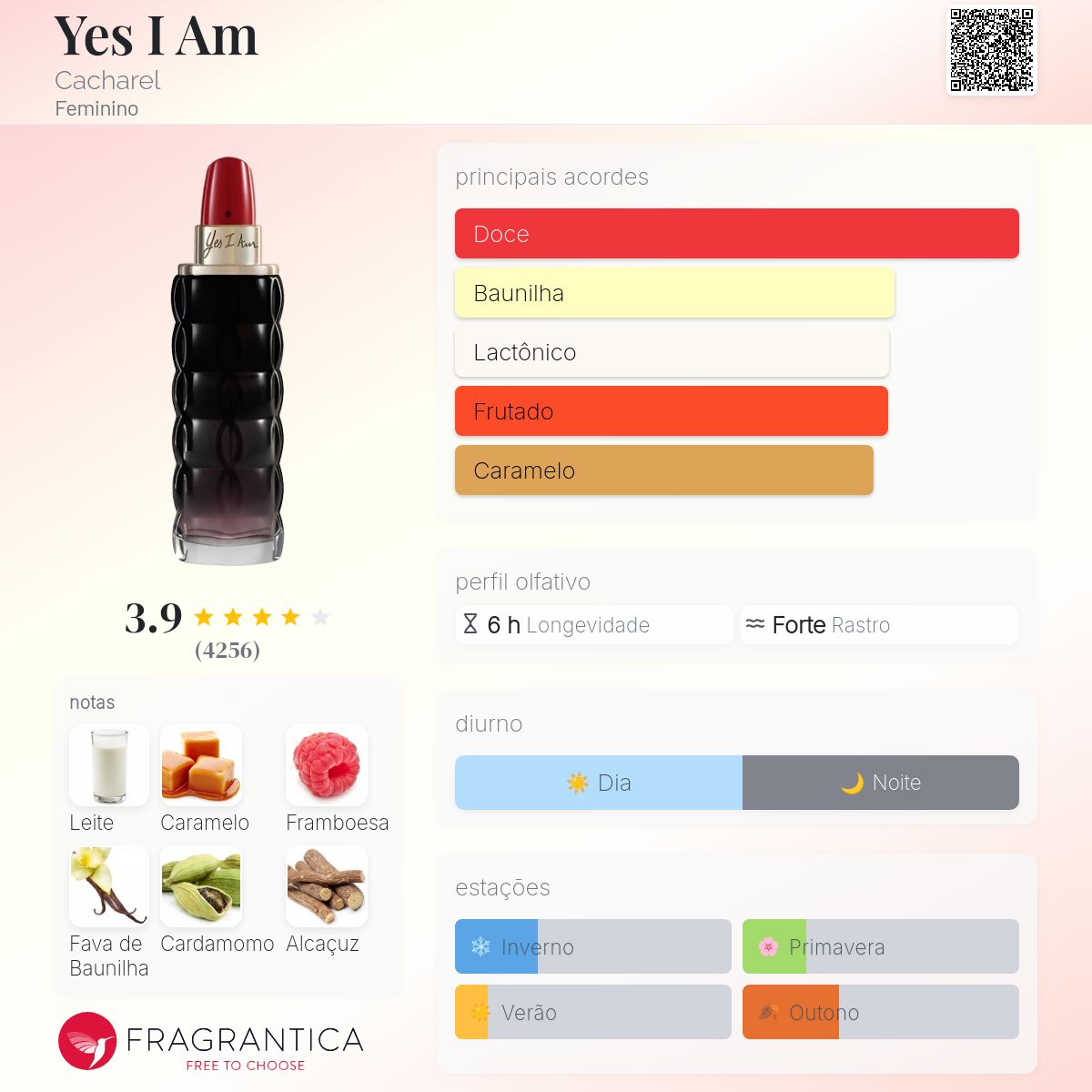 Yes I Am é um perfume feminino da família Oriental Floral Gourmand, com classificações adocicado, baunilhado, gourmand, frutado, floral branco, especiado e ambarado, trazendo uma fragrância cremosa, envolvente e super feminina. A abertura combina framboesa, mandarina, bergamota e limão, trazendo um toque frutado e levemente cítrico, evolui para um coração floral com jasmim, flor de laranjeira e gardênia, e finaliza com uma base doce e cremosa de leite, caramelo, baunilha e benjoim, criando aquele efeito “doce de maquiagem” viciante e marcante